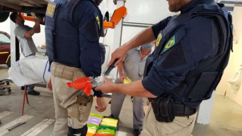 Com os fortes indícios de que transportava algum ilícito, a PRF acionou o canil da PM para apoiar nas buscas. Com a sinalização do cão farejador apontando para o tanque de combustível, o carro foi levado até uma oficina para poderem realizar a desmontagem do tanque.