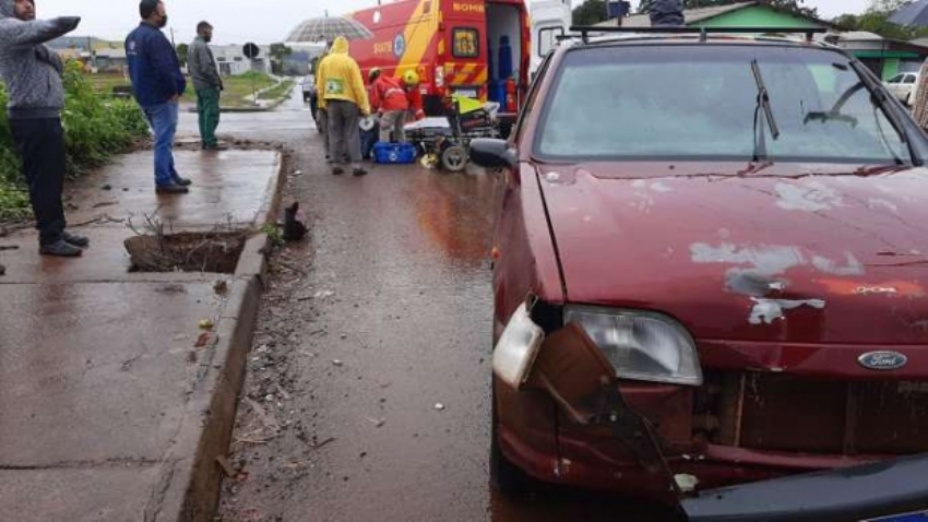 A cadeirante de 62 anos ficou ferida ao ser atropelada por carro na manhã desta quarta-feira (19), na Rua Sócrates cruzamento com a Adolfo Garcia, Bairro Interlagos, região norte de Cascavel.