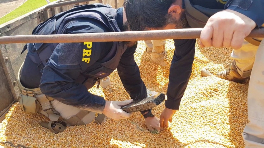 6,3 toneladas de maconha foram apreendidas pela Polícia Rodoviária Federal (PRF) em Guaíra, no oeste do Paraná, na segunda-feira (31). A droga estava escondida em meio a uma carga de milho.