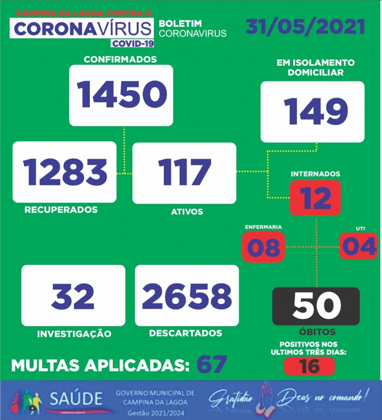 Os casos ativos caíram de 140 para 117, pessoas aguardando resultado de exames que eram 68 caíram 32 e também uma boa queda nos números de pessoas monitoradas, em relação ao informe anterior são 51 pessoas a menos, de 208 caiu para 149, pacientes internados são 12 sendo 07 em enfermarias e 05 em UTI.