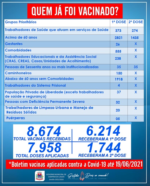 Segundo os dados do vacinômetro, até o último dia 19 de junho, o município havia recebido 8.674 vacinas das quais 7.958 já haviam sido aplicadas, sendo 6.214 para primeira dose e 1.744 para segunda dose.