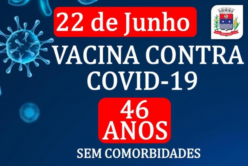 Nesta terça-feira, 22 de junho, o município de Campina da Lagoa irá ampliar a vacinação contra a Covid-19 para pessoas com 46 anos ou mais retornando à imunização do público em geral, é necessário que as pessoas se dirigem até o terminal rodoviário das 08:00 as 11:00 horas e das 13:30 as 16:00 horas, munidos de Identidade, CPF e Cartão do SUS.