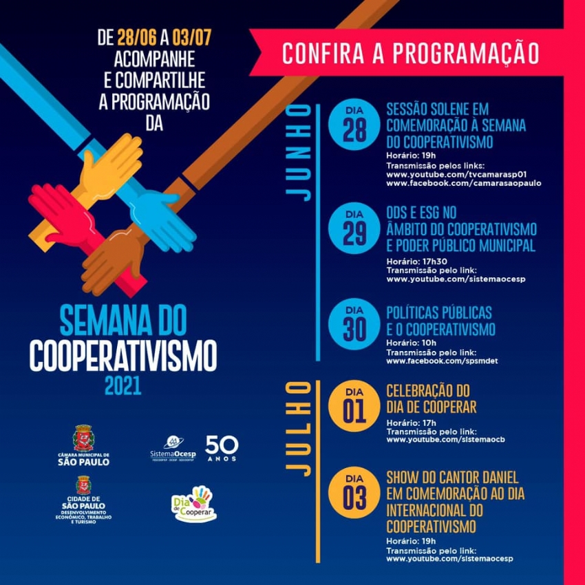 Todos os anos, as cooperativas brasileiras se juntam para transformar realidades por meio de ações de voluntariado e responsabilidade social que integram o Dia de Cooperar. Para celebrar esse importante movimento e o Dia Internacional do Cooperativismo, que neste ano será comemorado no dia 3 de julho, o Sistema Ocesp, em parceria com o Sicredi, realiza uma semana inteira de ações on-line, com um grande show de encerramento com o cantor Daniel.