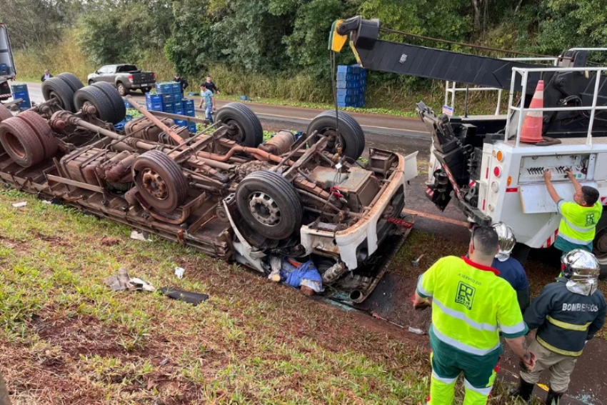 De acordo com os bombeiros, o caminhão trafegava sentido Foz do Iguaçu, quando atravessou a pista contrária. O veículo parou com as rodas para cima, ainda na rodovia.