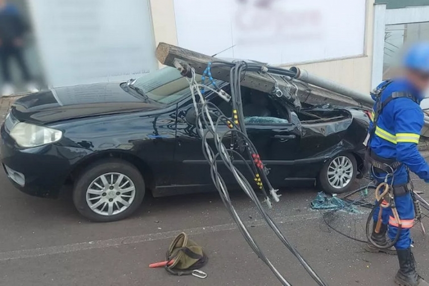 Um poste de energia caiu em cima de um carro nesta quarta-feira (14), em Pato Branco, na região do sudoeste.
