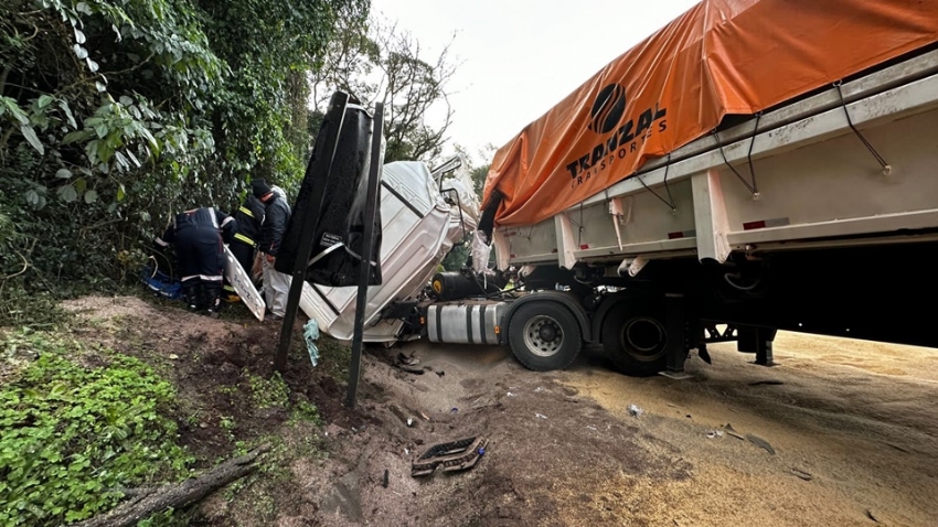 Uma violenta colisão frontal entre duas carretas no início da manhã desta sexta-feira, 7, na rodovia PRC-487, causou a morte de uma pessoa e deixou outras duas feridas, uma delas em estado grave.