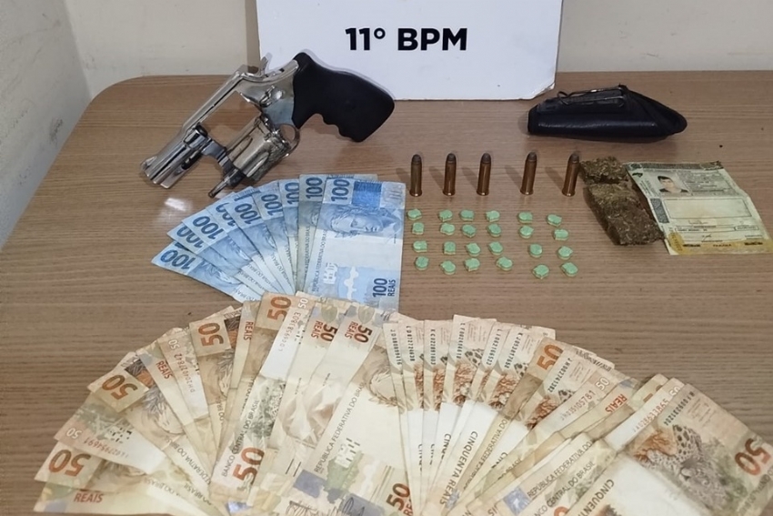 Na busca, a equipe encontrou um pacote tipo ziplock contendo 24 comprimidos de ecstasy, além de R$ 2.300,00 em dinheiro e a chave de um VW/Gol. O carro, estacionado em frente à chácara, também foi revistado, e nele os policiais localizaram um revólver calibre .357 carregado com cinco munições intactas, além de 20 gramas de maconha.