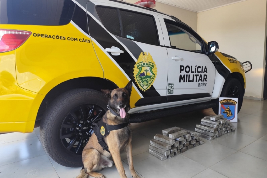 Durante a busca veicular, o cão policial Máximus indicou positivamente duas mochilas que estavam no bagageiro. Dentro delas, os policiais encontraram a droga embalada em tabletes.