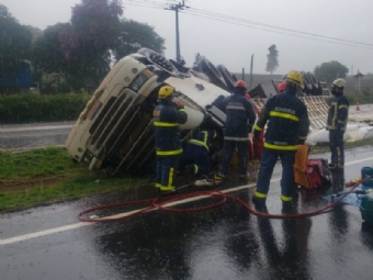 Carreta carregada com carga de arroz tomba no anel viário e motorista fica preso às ferragens