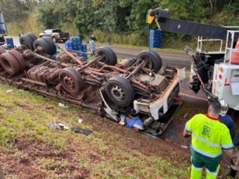 Motorista morre após caminhão carregado com pimentão tombar na BR-277, em São Miguel do Iguaçu