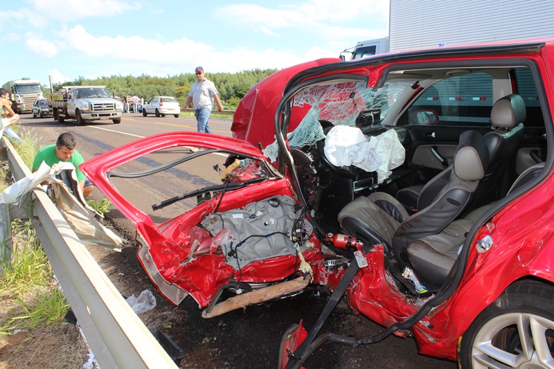 O Golf rodou na pista e chocou-se contra a carreta, depois bateu na proteção, às margens da pista e parou.