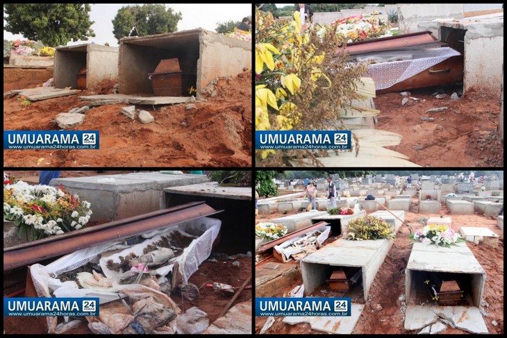 Uma cena triste de se ver; entre os corredores dos túmulos estavam espalhados flores, pedaços de concreto, roupas e pedaços dos caixões. Dos cinco túmulos violados, todos foram abertos, mas somente dois corpos sofreram com a ação dos criminosos. Um homem ainda sem a identidade divulgada estava no caixão, mas de bruços e uma mulher de 32 anos que faleceu há 20 dias estava fora do caixão. Os corpos foram encaminhados ao Instituto Médico Legal para realização de perícia.