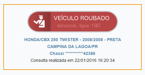 Em um cômodo da residência que fica do lado externo da residência havia uma motocicleta HONDA TWISTER CBX 250, placa APU-8772 e a mesma fora furtada juntamente com a chave e documento, além de objetos de pequeno o porte como joias, aparelhos eletrônicos, celular e alimentos.