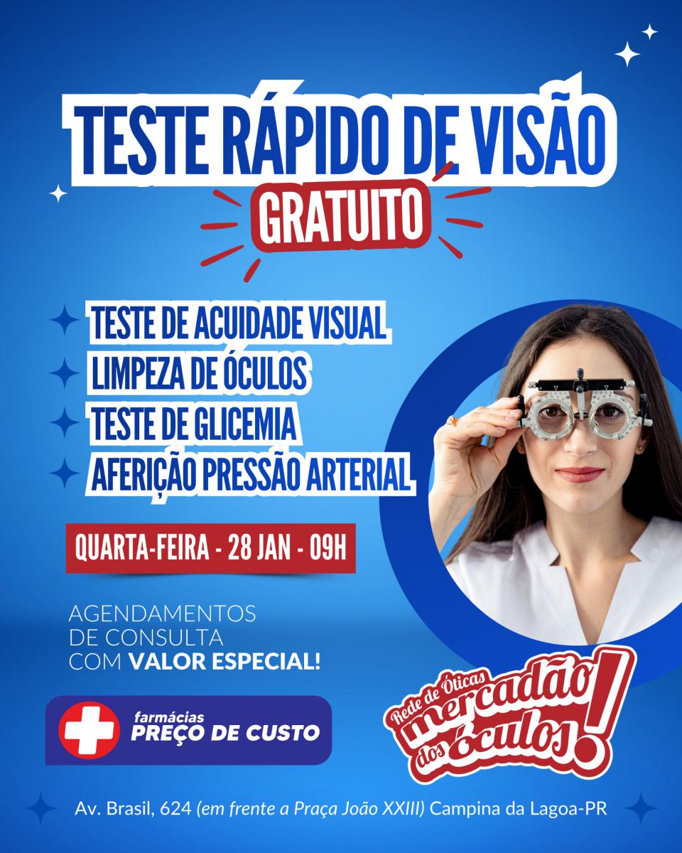 Moradores de Campina da Lagoa terão acesso a uma importante ação preventiva de saúde nesta quarta-feira (28), a partir das 9h, com a realização de teste rápido de visão gratuito e outros atendimentos essenciais à população.