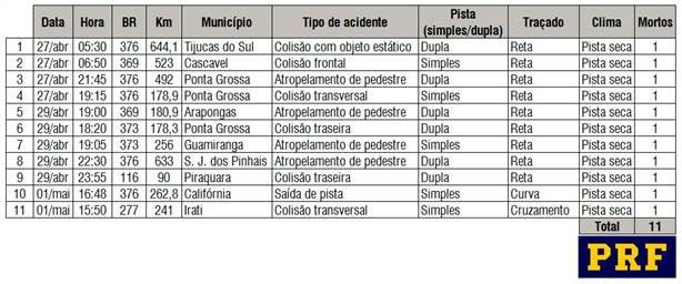 O feriado prolongado do Dia do Trabalho teve onze mortes nas rodovias federais que passam pelo Paraná. O número foi registrado pela Polícia Rodoviária Federal, que atendeu 109 acidentes que deixaram 120 pessoas feridas.