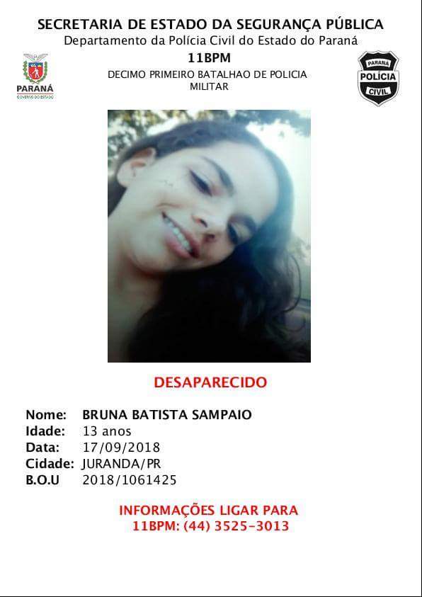 Na noite desta segunda-feira (17), por volta das 20:00 Horas, entrou em contato com a Polícia Militar de Juranda, uma Agente do Conselho Tutelar, juntamente com a mãe social uma mulher de 46 anos, informando que a adolescente, Bruna Batista Sampaio, 13 anos fugiu da Casa Lar, situada na Rua Timbira, por volta das 17:00 Horas.