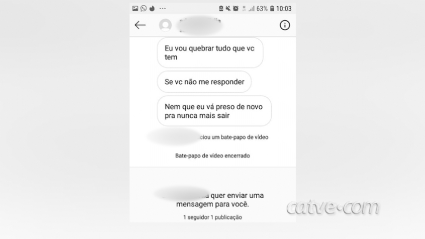 Em uma das conversas é possível ler as ameças digitadas pelo agressor. "Uma hora você vai estar em casa. Eu vou te pegar, juro por Deus". Em outro momento o ex-namorado afirma não ter medo de ser preso novamente. "Eu vou te matar, vou quebrar tudo que você tem se não me responder, nem que eu vá preso de novo para nunca mais sair".