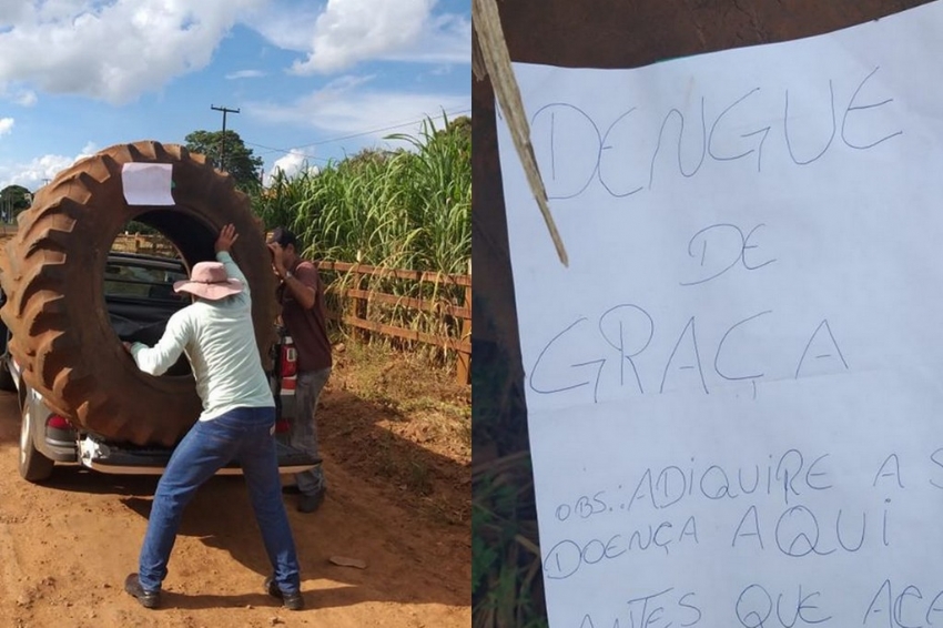 Através de uma denúncia, os servidores encontraram um pneu de trator jogado na proximidade do trevo na entrada da cidade, cheio d´agua parada e com larvas do mosquito da dengue.