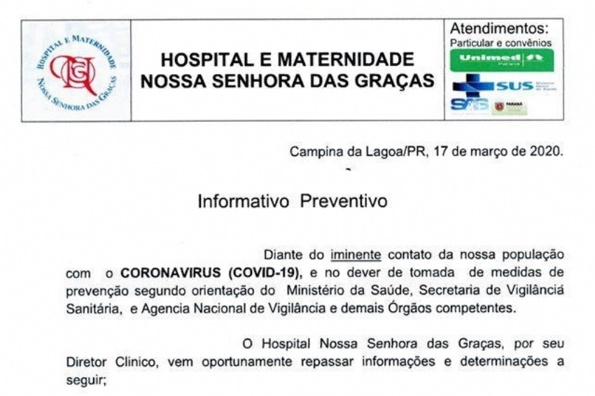 O Hospital Nossa Senhora das Graças de Campina da Lagoa emitiu uma nota nesta terça-feira 17, informando algumas medidas de prevenção quanto ao eminente perigo de contágio pelo coronavirus (COVID-19).