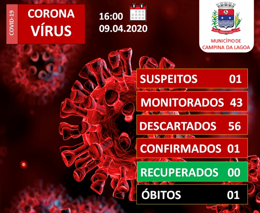 No último boletim do estado na data de ontem 08 de abril, havia 01 caso descartado e 01 em investigação no município de Campina da Lagoa. O boletim divulgado nesta quinta-feira (09), apresenta 01 confirmado, 01 óbito, 02 descartado e 01 em investigação.