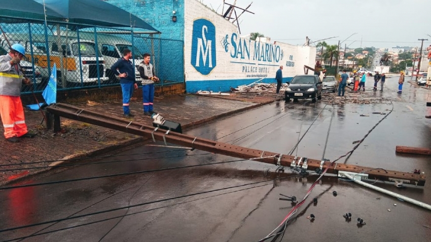 Além de destelhar o estacionamento do hotel, o vento derrubou dois postes, que atingiram dois veículos. Ninguém ficou ferido.
