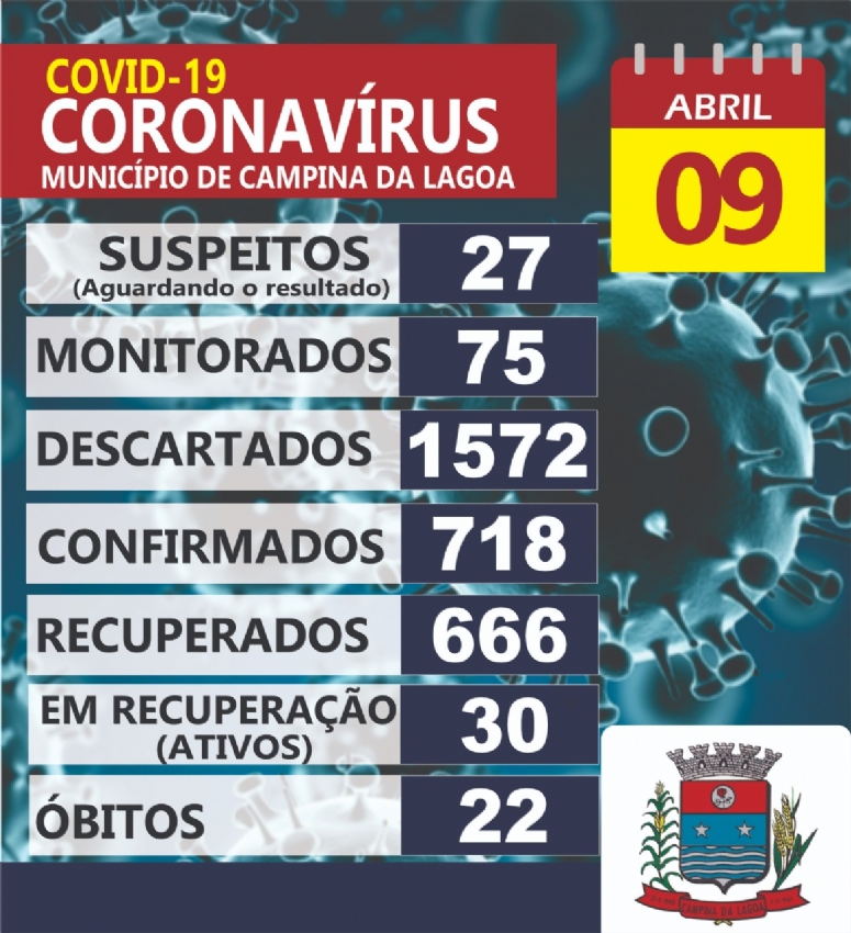 O município ainda registrou 27 casos suspeitos e 718 casos confirmados, destes 30 estão em recuperação.