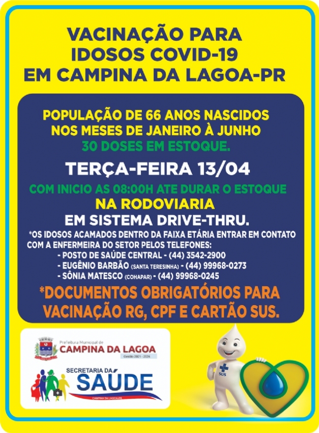 A Secretaria de Saúde divulgou que irá imunizar nesta terça-feira (13), idosos com 66 anos, nascidos entre os meses de janeiro e junho de 1955, a partir das 08:00 Horas na Rodoviária em sistema de DRIVE-THRU.