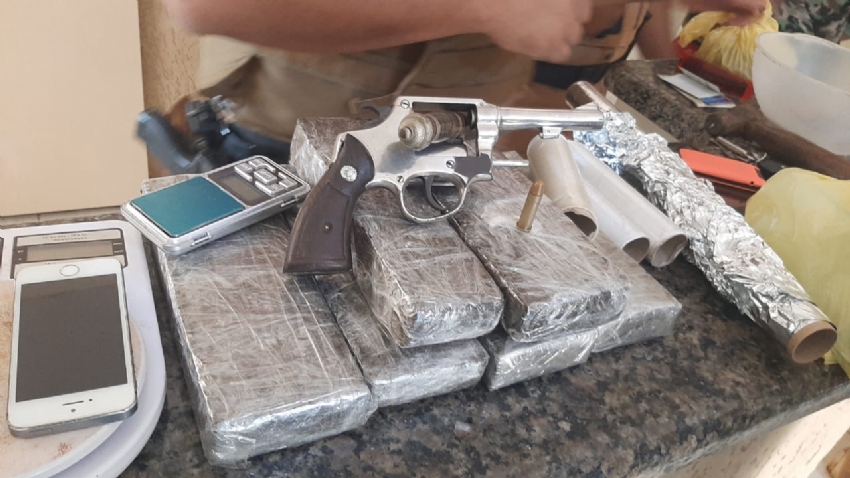 Na casa do suspeito, além de alguns pertences da vítima, foram apreendidos um revólver calibre 38, 4 quilos de maconha, 75 gramas de cocaína, 180 gramas de crack, três balanças de precisão, vasto material utilizado para embalar entorpecentes e até um caderno com anotações de venda de drogas.
