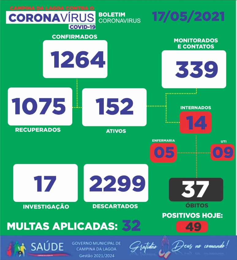 Boletim Covid-19 divulgado nesta segunda-feira (17), traz 49 novos casos positivos elevando para 1264 os casos confirmados, embora houve um aumento significativo nos casos positivos comparado ao último boletim divulgado, temos que levar em conta que estes números se referem a sábado, domingo e segunda.