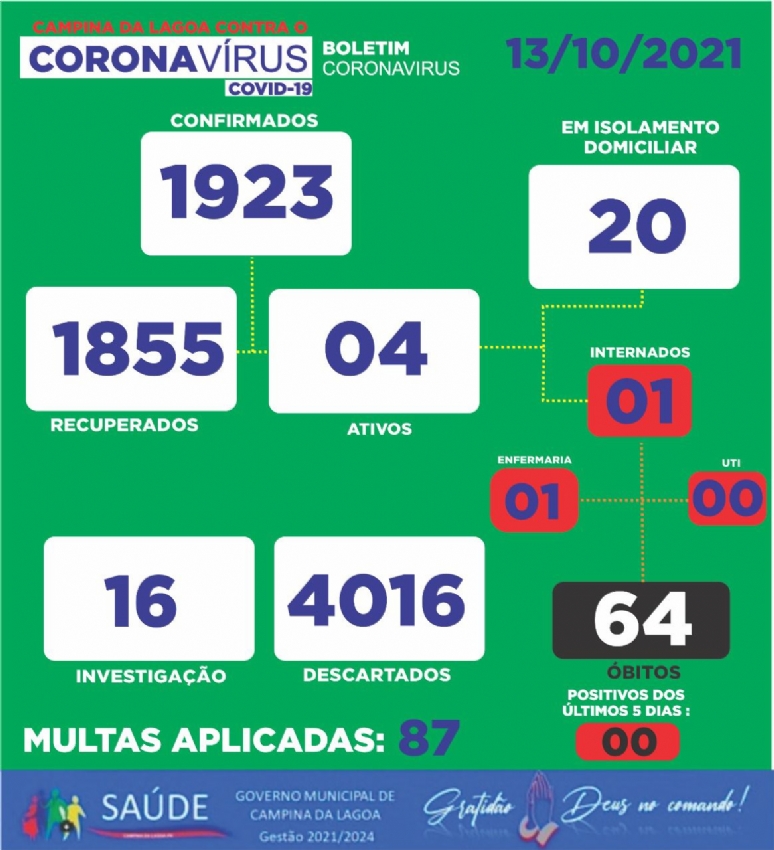 O boletim ainda trouxe resultado positivo quanto ao número de casos ativos que continuam baixando, o município existe apenas 04 casos ativos no momento, pessoas aguardando resultado de exame são 16 e 20 em isolamento.