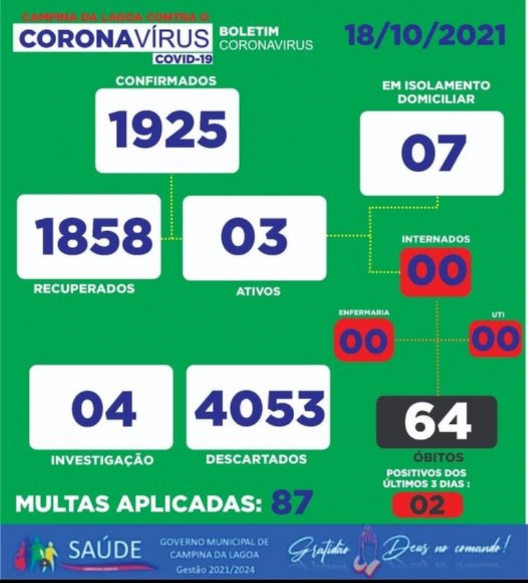 Desde o início da pandemia foram registrados 1.925 casos positivos dos quais 1.858 se recuperaram e infelizmente desde o início da pandemia o foram registrados 64 óbitos em decorrência da doença.