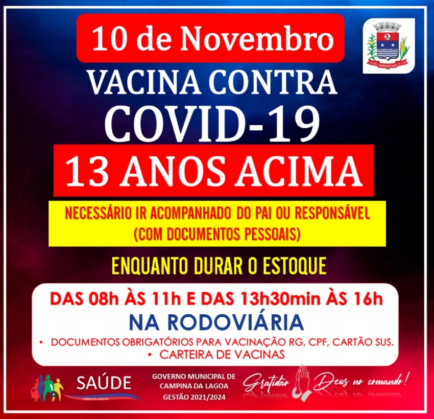 O município de Campina da Lagoa irá vacinar nesta quarta-feira (10), com a primeira dose, adolescentes com 13 anos de idade contra a covid-19.