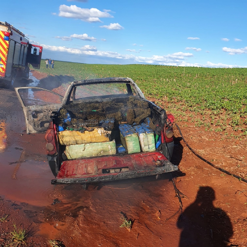 Um carro carregado com maconha pegou fogo e ficou destruído após ser perseguido pela polícia nesta quarta-feira (02).