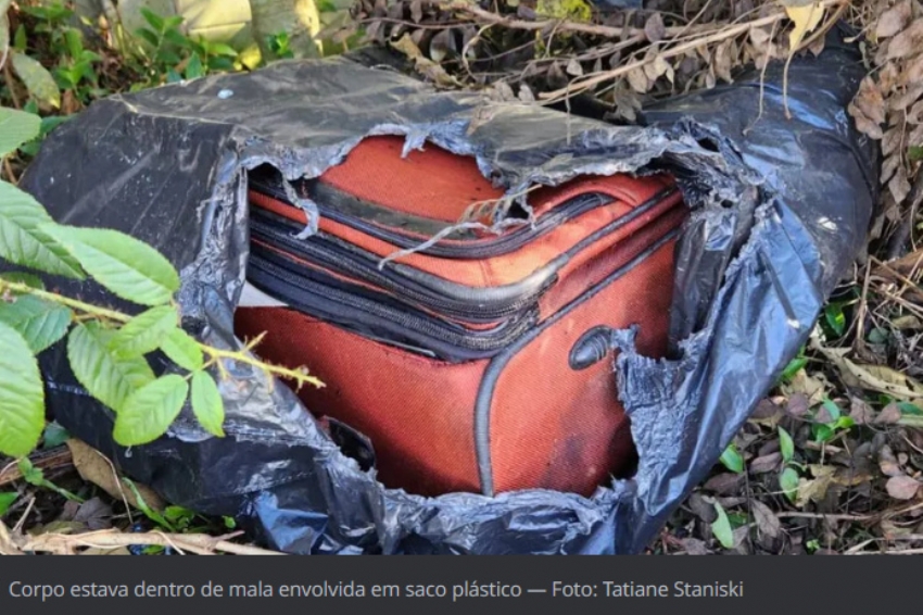 Um corpo foi localizado dentro de uma mala de viagem em um terreno de Campo Largo, na Região Metropolitana de Curitiba (RMC). O local tem uma roça e não é totalmente cercado.