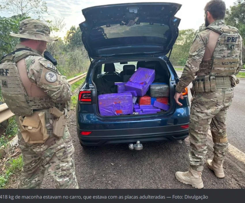 A Polícia Rodoviária Federal (PRF) apreendeu 418 kg de maconha na manhã desta terça-feira (29) em um veículo que transitava pela BR-272, em Goioerê, no noroeste do Paraná.