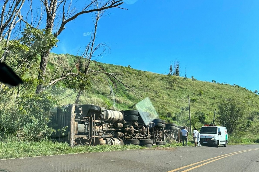 O motorista de um caminhão com placas de São José, Rio Grande do Sul, perdeu o controle da direção em uma curva e acabou saindo da pista e tombando as margens da rodovia.
