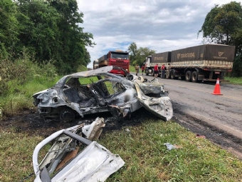 | Quatro pessoas da mesma família ficam feridas após carro bater em caminhão e pegar fogo na PR-280 | |||